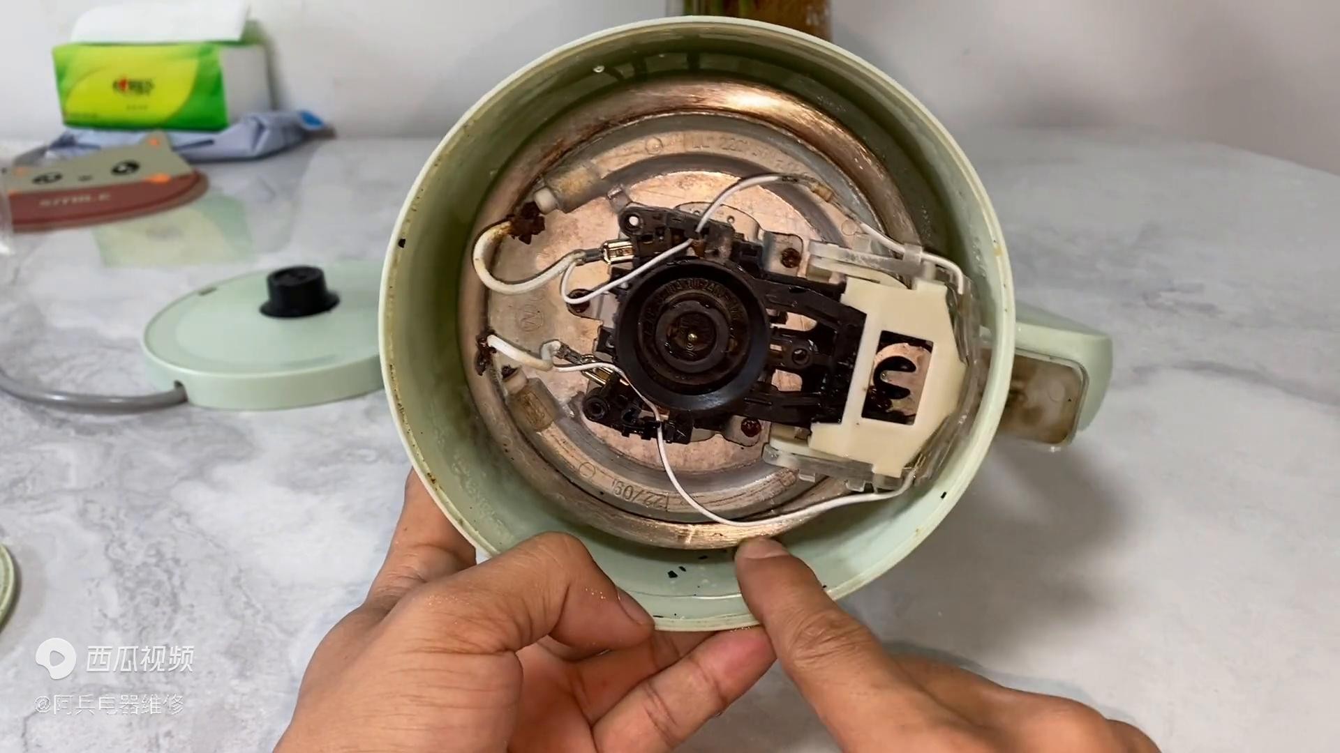 ·像这个一般的都是电水壶内部有故障的,像这个底座肯定是没有问题的,是通电的,所以说我们需要把这个给它拆开。像这边有三个螺丝,我们直接给它拧掉。其实像这个一打开,基本上一看我们就知道了,不需要忘了表什么专业工具来检查的,然后壳子一敲就拿掉了,打开过后里面就是这样子的。