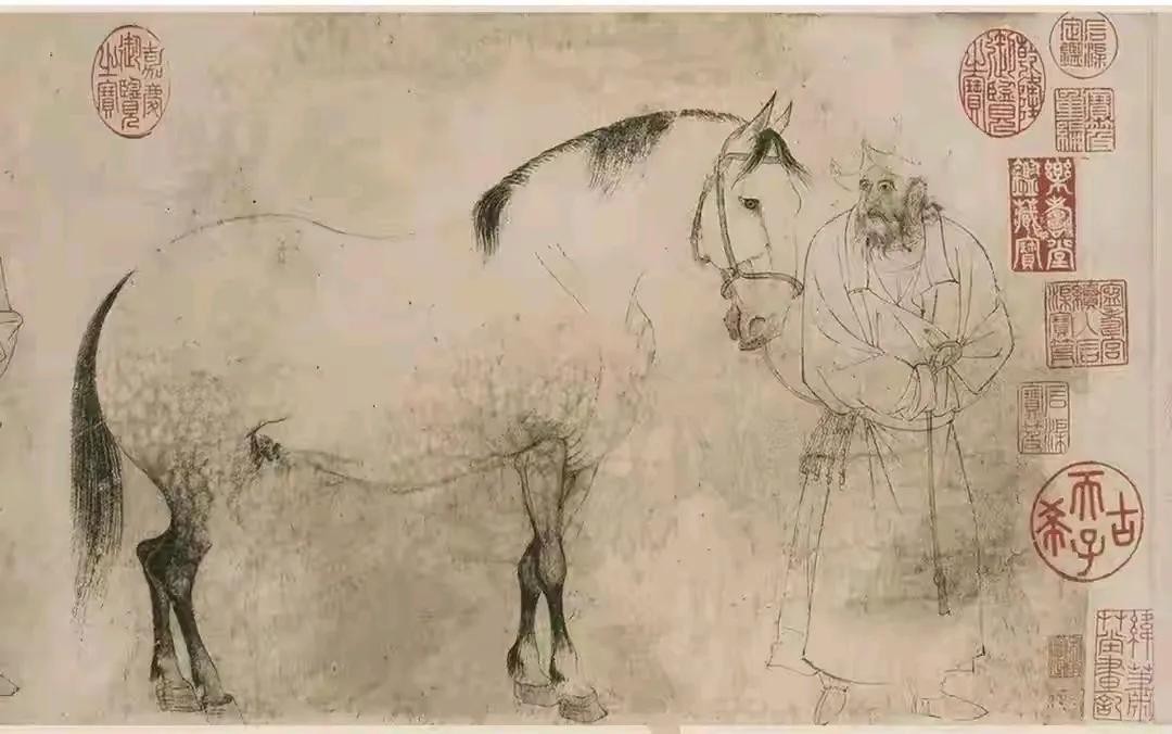 李公麟将传统白描从草稿阶段提升为独立艺术形式,摒弃色彩,仅以线条的浓淡、粗细、刚柔表现物象的形神,形成了“扫去粉黛、淡毫轻墨、高雅超逸”的独特风格。他的线条融合书法用笔技巧,兼具吴道子的灵动与晋人书法的简雅,如《五马图》中马的筋肉与人物衣纹的刻画,笔笔精到,被称为“天下绝艺”。