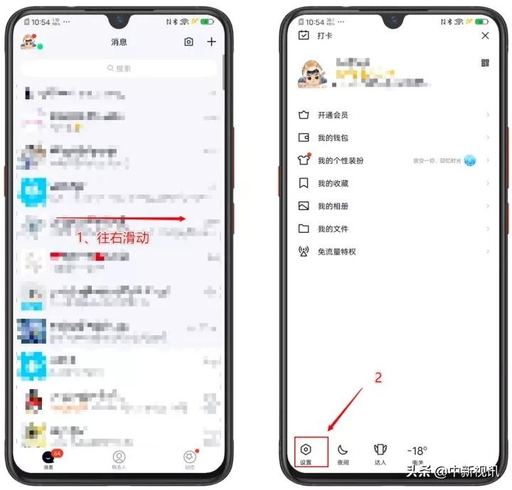 首先我们在旧手机上打开QQ,屏幕往右滑动,然后点击左下角的“设置”。