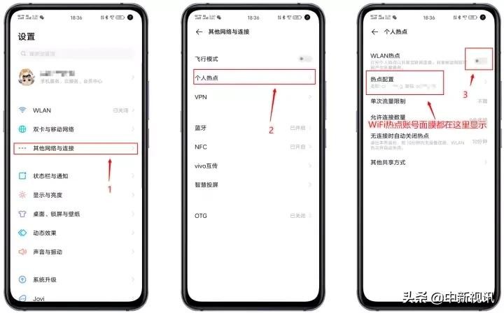 2、 旧手机连接上新手机的WiFi热点,那么如何设置WiFi热点呢?打开新手机的设置,然后点击“其他网络与连接“,然后点击”个人热点“,然后打开图示这个开关,然后在旧手机上按照这个WiFi热点名称和密码连接上即可。