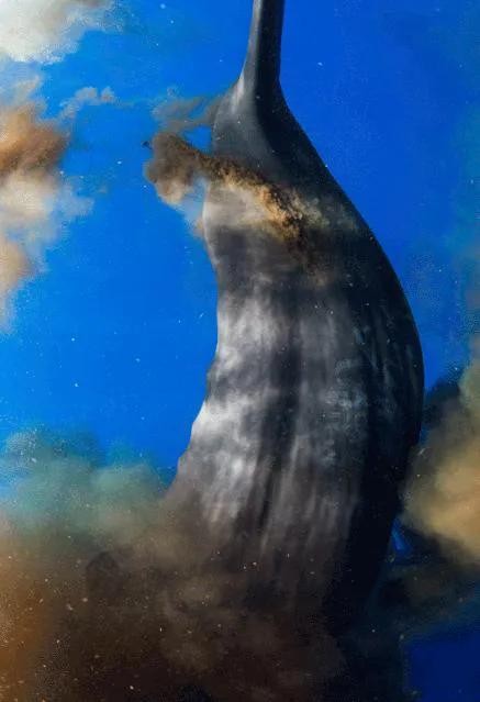 就在这时,令人意想不到的事情发生了!只见抹香鲸们突然齐刷刷地挥动起它们那巨大的尾巴,一股黑色的液体从它们的尾部喷射而出,瞬间形成了一个巨大的“粪便泡”。这泡粪便可是黑得发亮,红得吓人,就像是一团巨大的黑红色烟雾,在海水中弥漫开来。