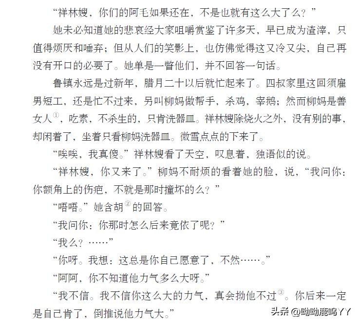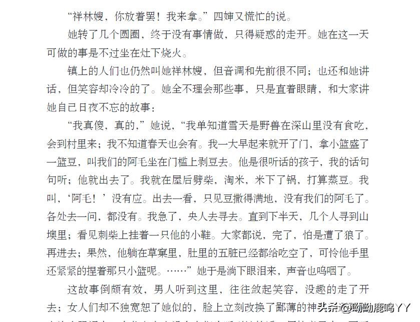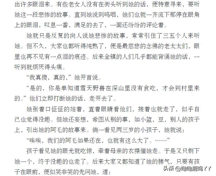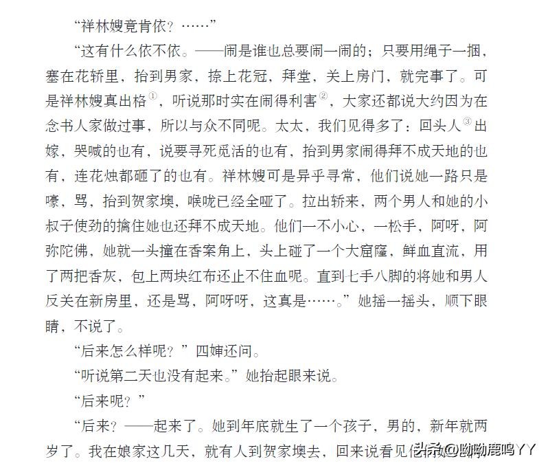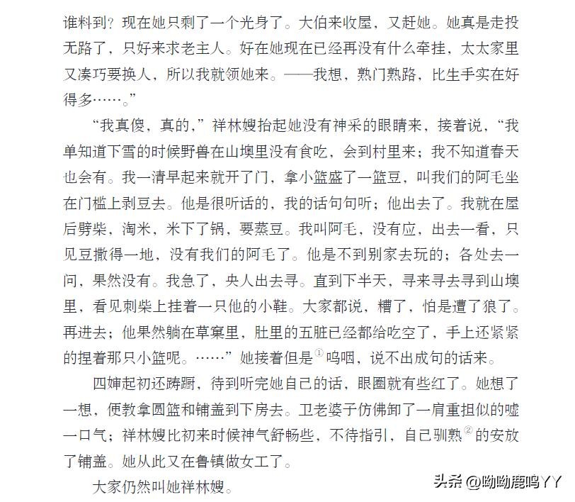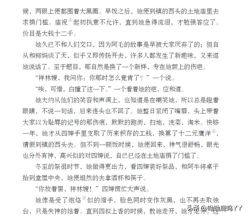 文章开篇,鲁迅先生通过主人公祥林嫂的悲惨遭遇,描绘了一个被封建礼教束缚、被社会遗弃的妇女形象。祥林嫂的一生,从年轻守寡、被迫再嫁、再到丧子之痛,每一步都充满了无奈和悲哀。鲁迅先生通过对祥林嫂命运的叙述,深刻揭示了旧社会对女性的残酷压迫和精神摧残。