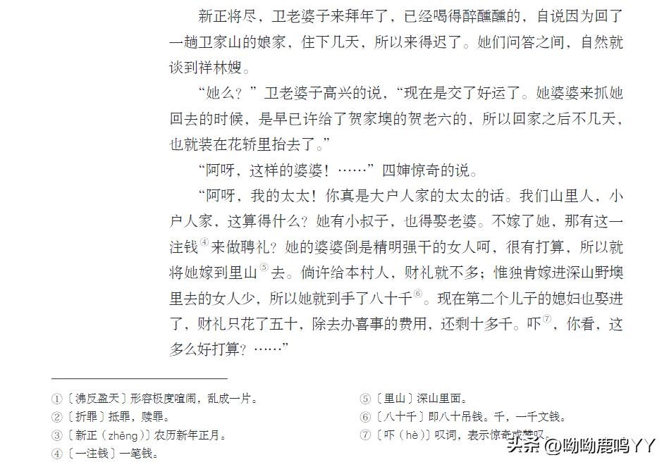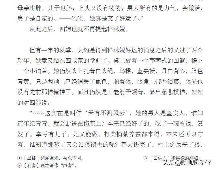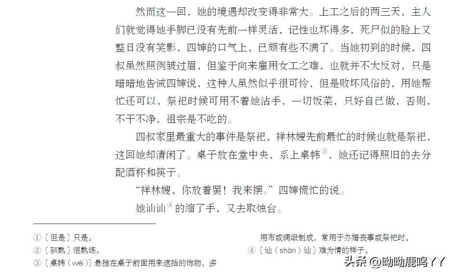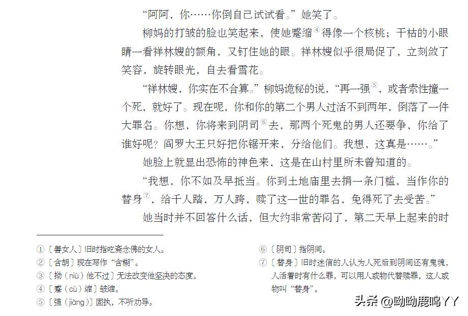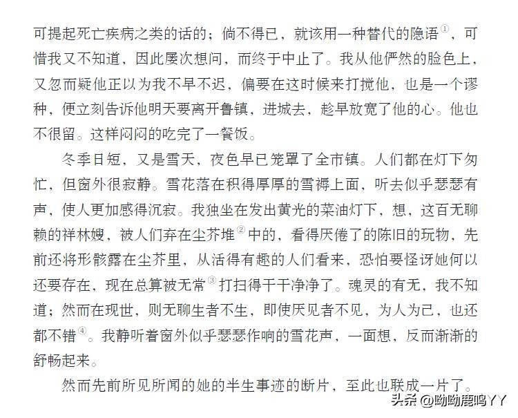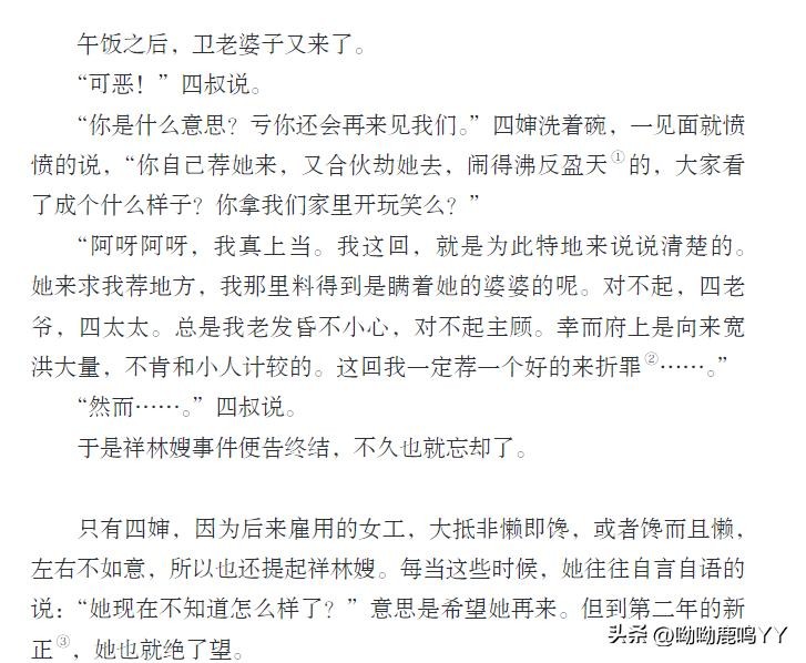 文章开篇,鲁迅先生通过主人公祥林嫂的悲惨遭遇,描绘了一个被封建礼教束缚、被社会遗弃的妇女形象。祥林嫂的一生,从年轻守寡、被迫再嫁、再到丧子之痛,每一步都充满了无奈和悲哀。鲁迅先生通过对祥林嫂命运的叙述,深刻揭示了旧社会对女性的残酷压迫和精神摧残。