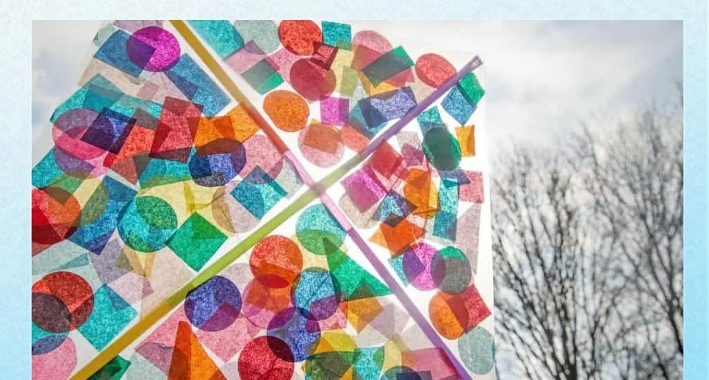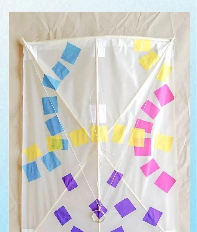 在彩色纸上剪下各种形状,如正方形、圆形或三角形,作为风筝的装饰。
