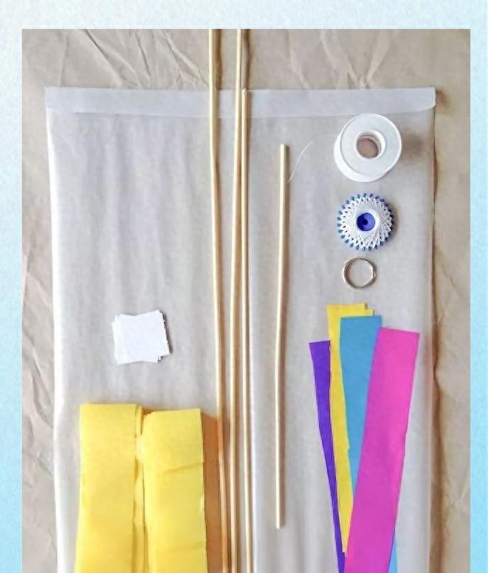 准备轻便的骨架、色彩斑斓的纸张或布料,以及用于固定和装饰的线绳。