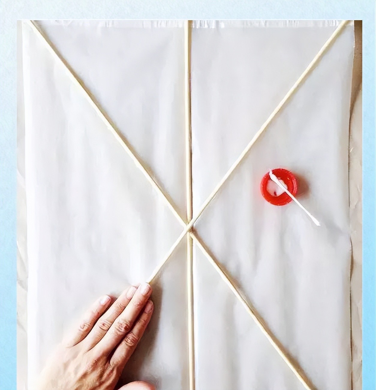 在风筝脊柱的中间以及左侧和右侧位置,用牙签分别打上两个洞。