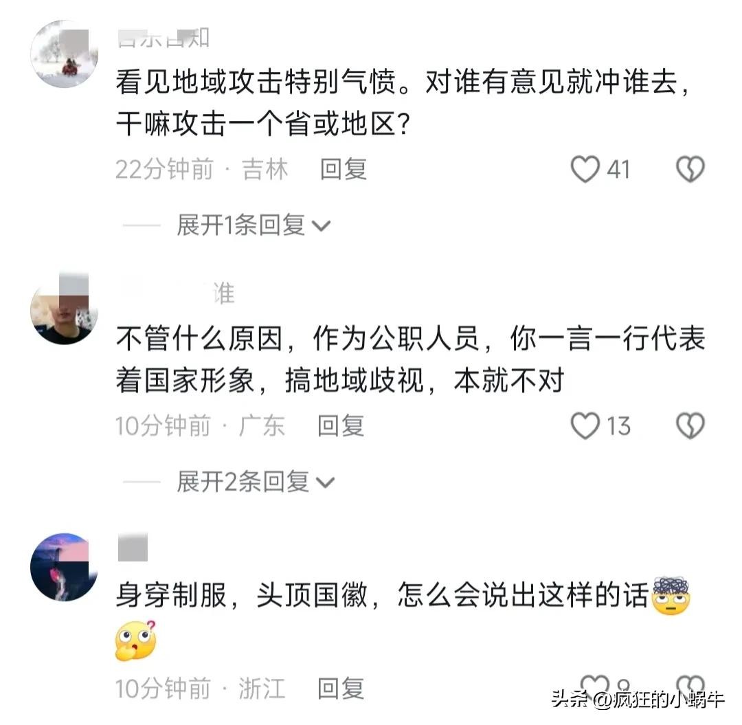 有网友说,身穿制服,头顶国徽,你的一言一行就代表着国家形象,怎么能搞地域黑,对一个人有意见,或者和一个人发生了矛盾,为啥把矛盾扩大到一个省?