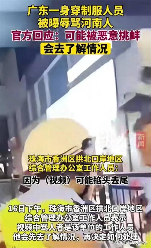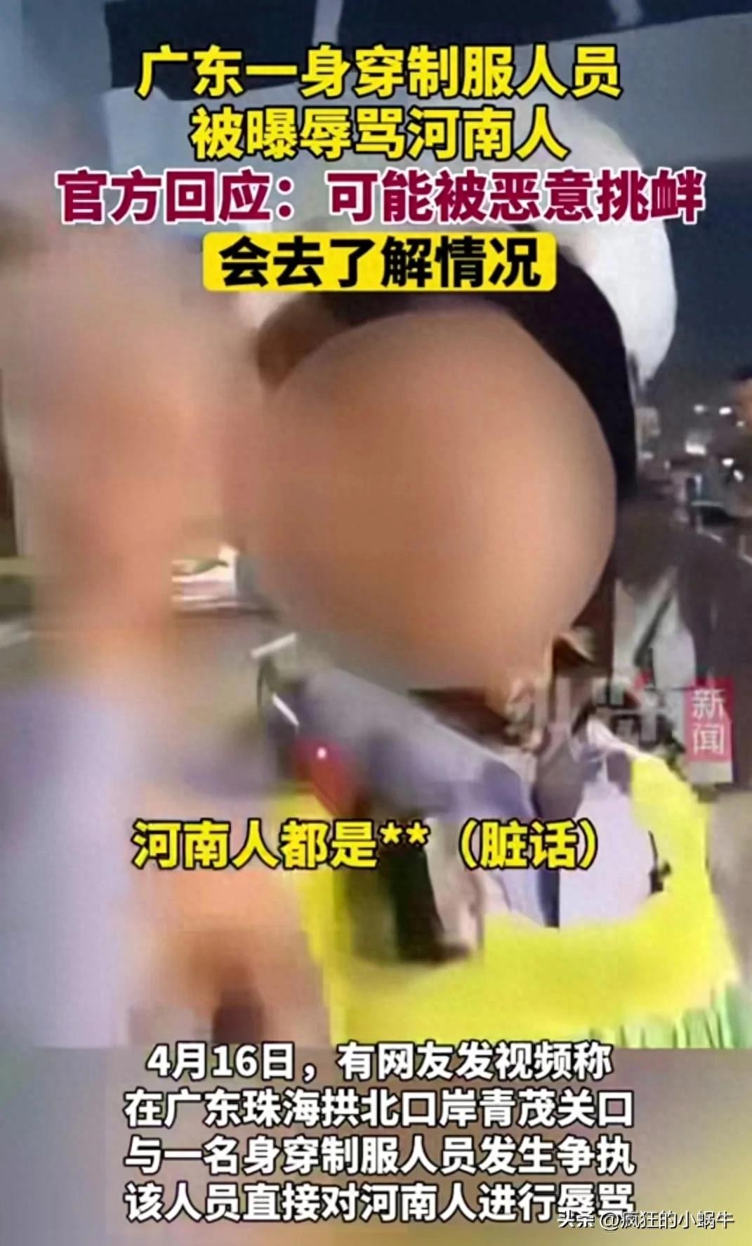 事情发生在4月16日下午,广东珠海拱北口岸青茂关口,身穿制服的男子脸憋的通红,看的出来,当时是十分的愤怒,在拍摄视频的男子也在一直的激怒着制服男,拍摄视频的男子一直在说,你再说一遍,我立马发到河南的群里面去,于是制服男便又说了一遍,河南人都是XX。从两人的对话中可以看出两人当时都是相当的激动,在这之前应该发生了什么不愉快的事情。