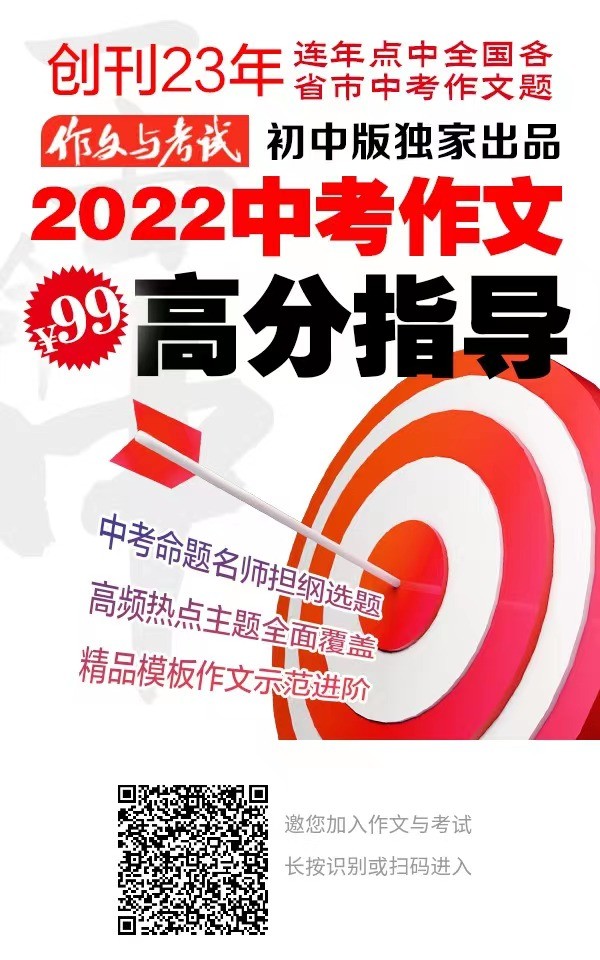 《2022年中考作文高分指导》隆重上市了!由中考命题名师担纲选题!50道高频热点主题全面覆盖!100篇精品模板作文示范进阶!由“中考点题金刊”——《作文与考试》初中版独家出品,助力你2022中考作文旗开得胜!