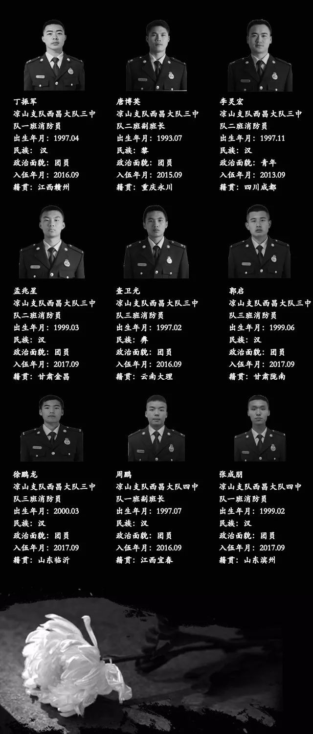 经统计核实,有27名同志系凉山州森林消防支队指战员。27人中有干部4人、消防员23人。汉族22人、满族1人、黎族1人、彝族2人、畲族1人。1980年后出生1人,1990年后出生24人,2000年后出生2人,年龄最小为2000年7月出生。中共党员9人(含预备党员1人),共青团员11人,青年7人。