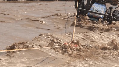 一对夫妇驾驶拖拉机被洪水围困,