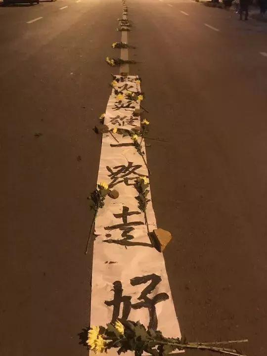 路面上摆放着菊花,写着挽言:救火英雄一路走好。
