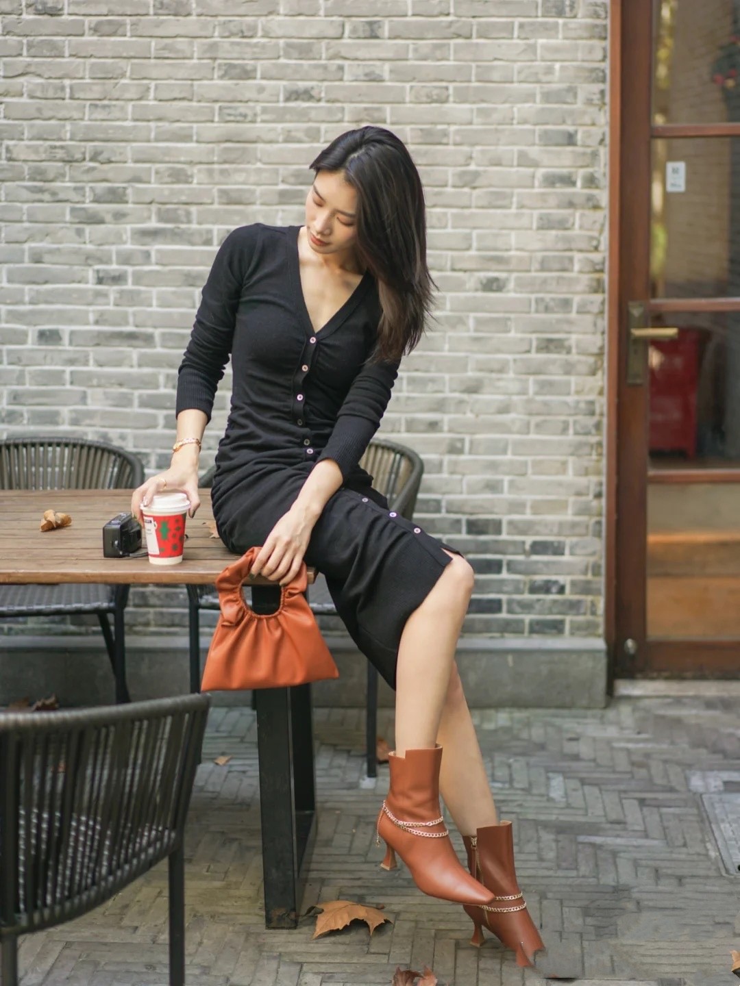 想要更加保暖一点的风格,可以尝试这种简约系的搭配。比如说经典的棕色短靴,也搭配了链条元素的修饰,呈现出一种更加帅气时髦的感觉。即便是配上一条修身的黑色连衣裙,也是非常提气质的搭配。