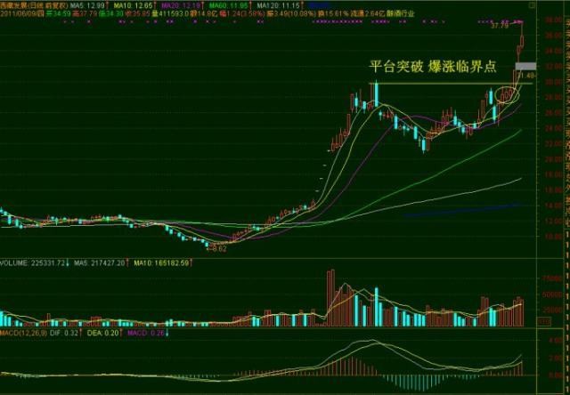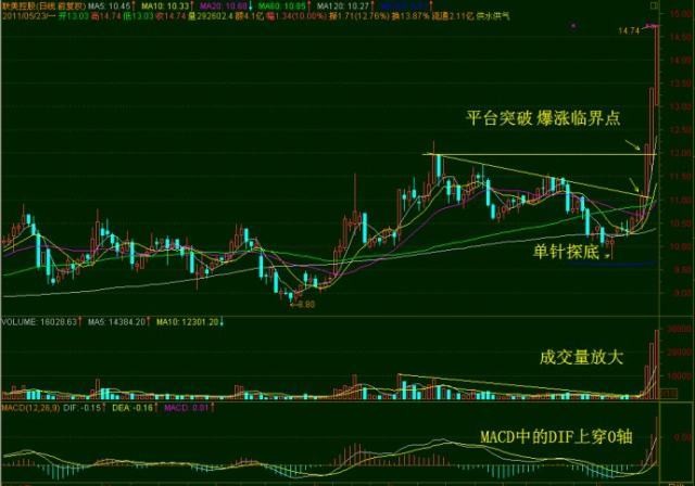 股价放量打拐的瞬间是爆涨临界点,平台突破的瞬间是爆涨临界点;股价过高点线的瞬间是爆涨临界点;小口径向上喷出的瞬间是爆涨临界点;过平台不准踏空,就是要求买在爆涨临界点上;爆涨临界点以前,线之下,是慢慢的涨,是匍匐前进;爆涨临界点,是噗哧窜出去,以后是跳跃的涨。