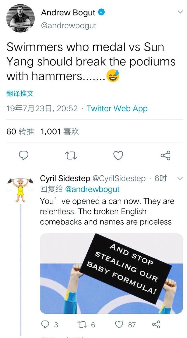 博古特在推特上写道:“这些和孙杨一起上领奖台的游泳运动员不如把领奖台砸了(笑哭表情)”博古特用“锤子砸颁奖台”的说法疑似是在嘲讽孙杨“砸碎血样瓶子”。