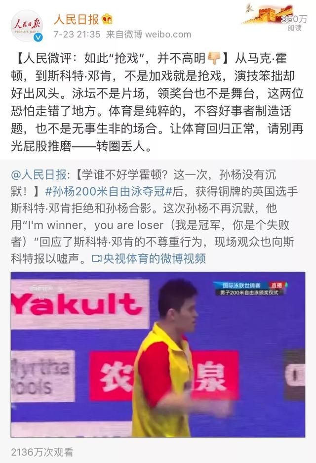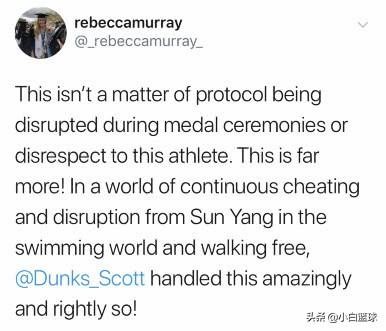 很快美国有一选手也在推特上发文写道,这不是协议在奖牌仪式中被破坏或不尊重这名运动员的问题。在泳坛里孙杨不断作弊和破坏泳坛的洁净,他还肆意横行。斯科特拒绝跟他合影的做法是令人惊讶且正确的。这就说的更明确了,孙杨“作弊”,而且是不断的作弊......