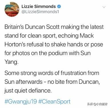 英国游泳选手莉齐·西蒙兹在推特上评论了孙杨跟斯科特的时间,他表示英国的斯科特为干净的游泳运动做出了争取的选择,他呼应了霍顿拒绝跟孙杨握手与合影,之后孙杨发出了一些强烈的挫败感言论,斯科特并没有搭理他,只是安静的蔑视。这个评论明显也是暗指孙杨“不干净”。