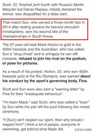 在文中他们先是表示孙杨拿下冠军是因为立陶宛选择犯规,孙杨捡了便宜,而且还写道,这是孙杨在2014年服用违禁兴奋剂药品后药检呈阳性禁赛三个月后在韩国拿下的第二个冠军,这就是在翻旧账,故意说孙杨之前服用违禁药品禁赛三个月。之后斯科特的发声也在文中清晰的看到,斯科特表示:“如果孙杨不尊重这项运动,我们干嘛要尊重他?”看起来孙杨药检事件真的让国际上对他没有了信任,都认为他是真正的不干净。