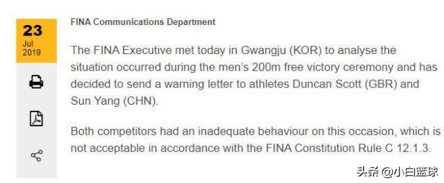 23日,国际泳联发表声明,因为韩国光州世锦赛男子200米自由泳颁奖仪式期间发生的事情,向英国运动员邓肯·斯科特和中国运动员孙杨发出警告。