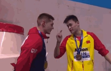 相似的一幕又出现在7月23日,孙杨在200米自由泳决赛中幸运卫冕,与俄罗斯选手并列获得第三名的斯科特虽然登上了领奖台,但拒绝与孙杨合影。“大白杨”这次选择了当场回应——他做出了挥拳的动作,并冲斯科特怒吼:“我是胜利者,你是失败者!”耐人寻味的是,斯科特当天接受媒体采访时称,自己是霍顿的支持者,“如果孙杨不尊重游泳,我们为什么要尊重他?”但英国选手的口风不到24小时就变了,改称,“我在这里得到了如此高的曝光度,也许对我来说是件好事。”