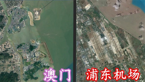 有个非常有趣的对比,澳门陆地面积基本上与上海浦东机场的占地面积相当,两地同比例下的卫星图大家可以对比一下。