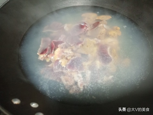 第三步给鸡杂焯水。起锅烧水,放入切好的的鸡杂,加入适量生姜和料酒,沸水煮1左右分钟,捞出再过水清洗干净,沥干净水分备用。这一步很重要,鸡杂经过焯水,基本上没有了腥味。
