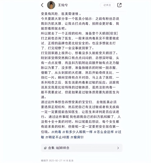 王灿为变天鹅颈做医美!打肉毒素过敏后背全是红抓痕,直呼要谨慎