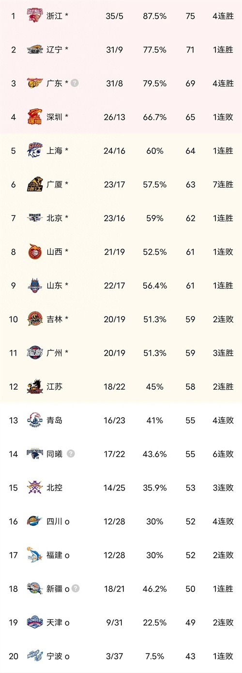 CBA最新积分榜:辽宁升第二,上海稳居第五,江苏赢球北控出局