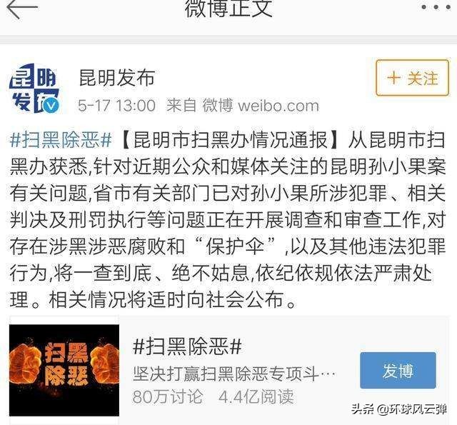 中央和地方,对这一轮扫黑除恶的决心和执行力,都是不言而喻的。对孙小果案,从昆明扫黑办,到中央政法委,都表达了鲜明而坚决的态度。事实多次证明,这决不是说说而已。现在舆论的所有担心,疑问,都会得到解答。正义可能会迟到,但一定回到。这一次,谁也救不了孙小果了。