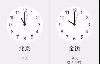柬埔寨比中国慢1小时,例如:北京时间11点时,柬埔寨时间是10点。