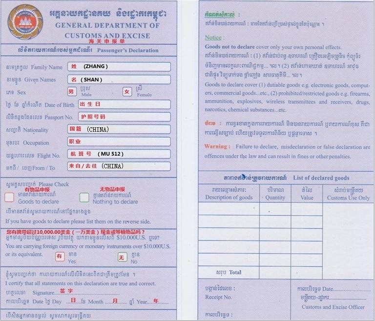 来柬中国公民如需办理落地签证,按要求用大写英文字母逐项填写该卡后即可在入境口岸办理,之后再持该卡办理入境手续,出境时无需另填其他表格。