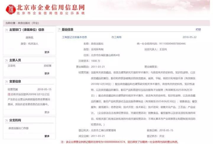 那么“故宫文创”又是怎么一回事呢?从天猫网店经营者营业执照看,它属于故宫出版社。故宫出版社又是直接隶属于国务院的事业单位。
