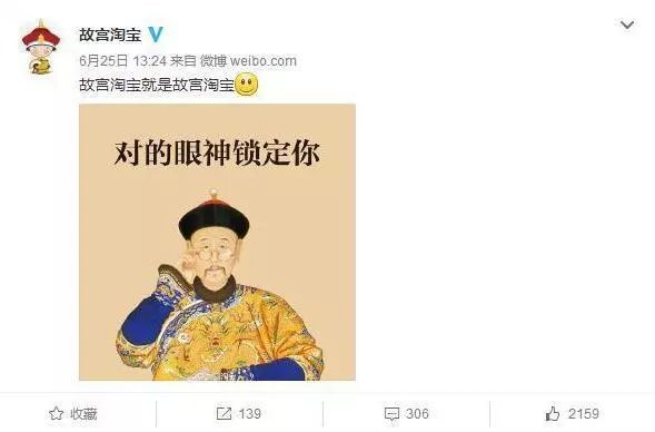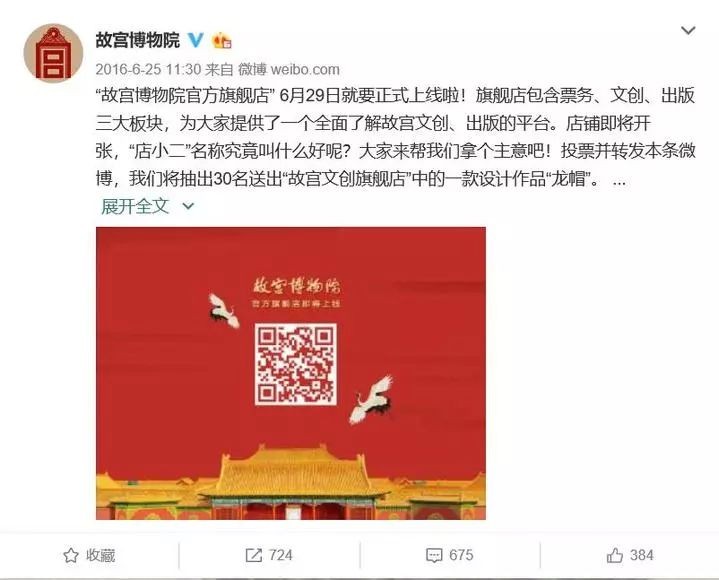 有意思的是,2016年,当“故宫博物院”官方微博发布旗舰店上线信息时,“故宫淘宝”马上跟上,说“故宫淘宝就是故宫淘宝”,还配了一个微笑的表情,后来又把这条酸溜溜的微博给删了。